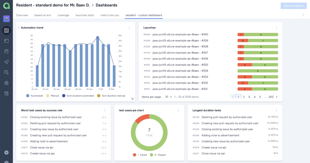 To put an end to non-reportable testing, Allure TestOps provides intuitive, user-friendly, and easy-to-use dashboards, so you can find every tool, process, and test result you need quickly and easily in real-time. Set up special dashboards for fellow testers, developers, and management and enjoy!