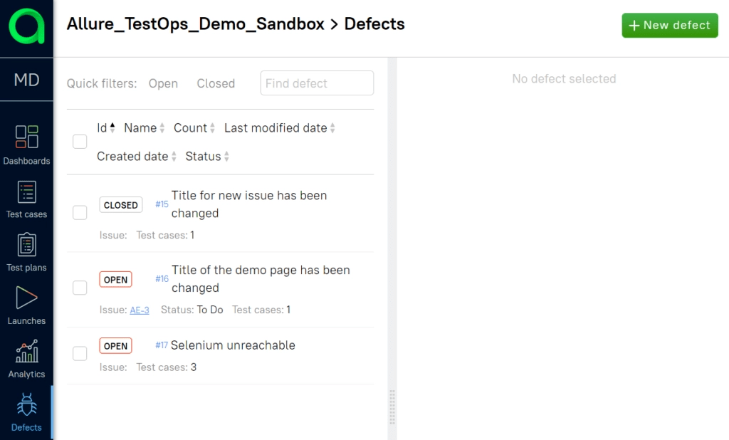 - New Defect button added. Just a minor UX improvement that allows a user to create a Defect from the Defects tab. There is no need to keep your launch open to create defects anymore, the same as no need to lurk through failed tests. Click create button and create Defect's automation rule from the Errors tab in a launch. Read more about the Defects feature in Allure TestOps.