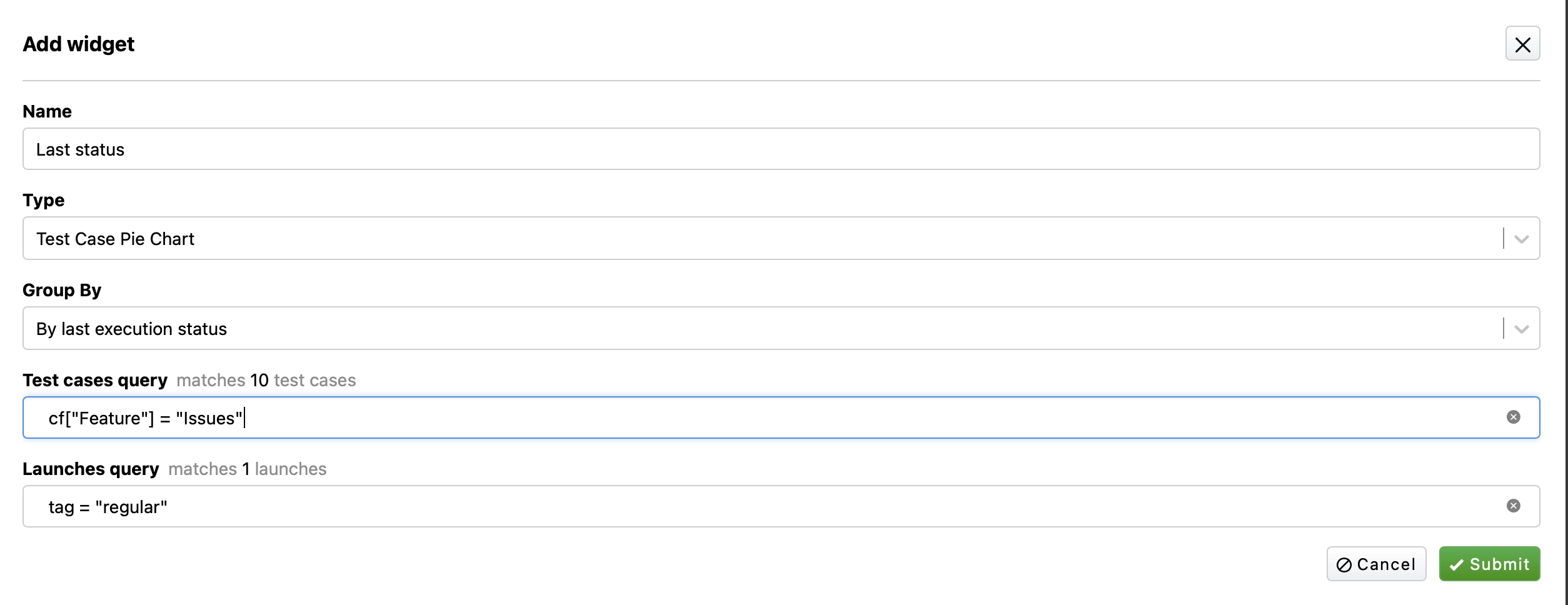 A useful feature for tests run in multiple environments such as testing, stable, master, etc. After marking launches by tags or by env, the widget shows the latest test status in selected launches. This allows checking conditions of specific environments, such as testing or preprod.