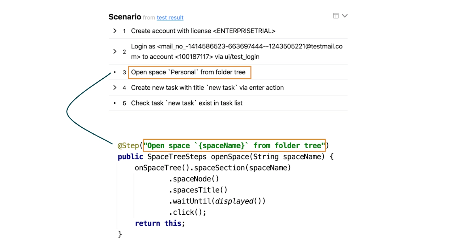For now we’re interested in the scenario part. Here you can see how the same step looks in the report section and in the code: