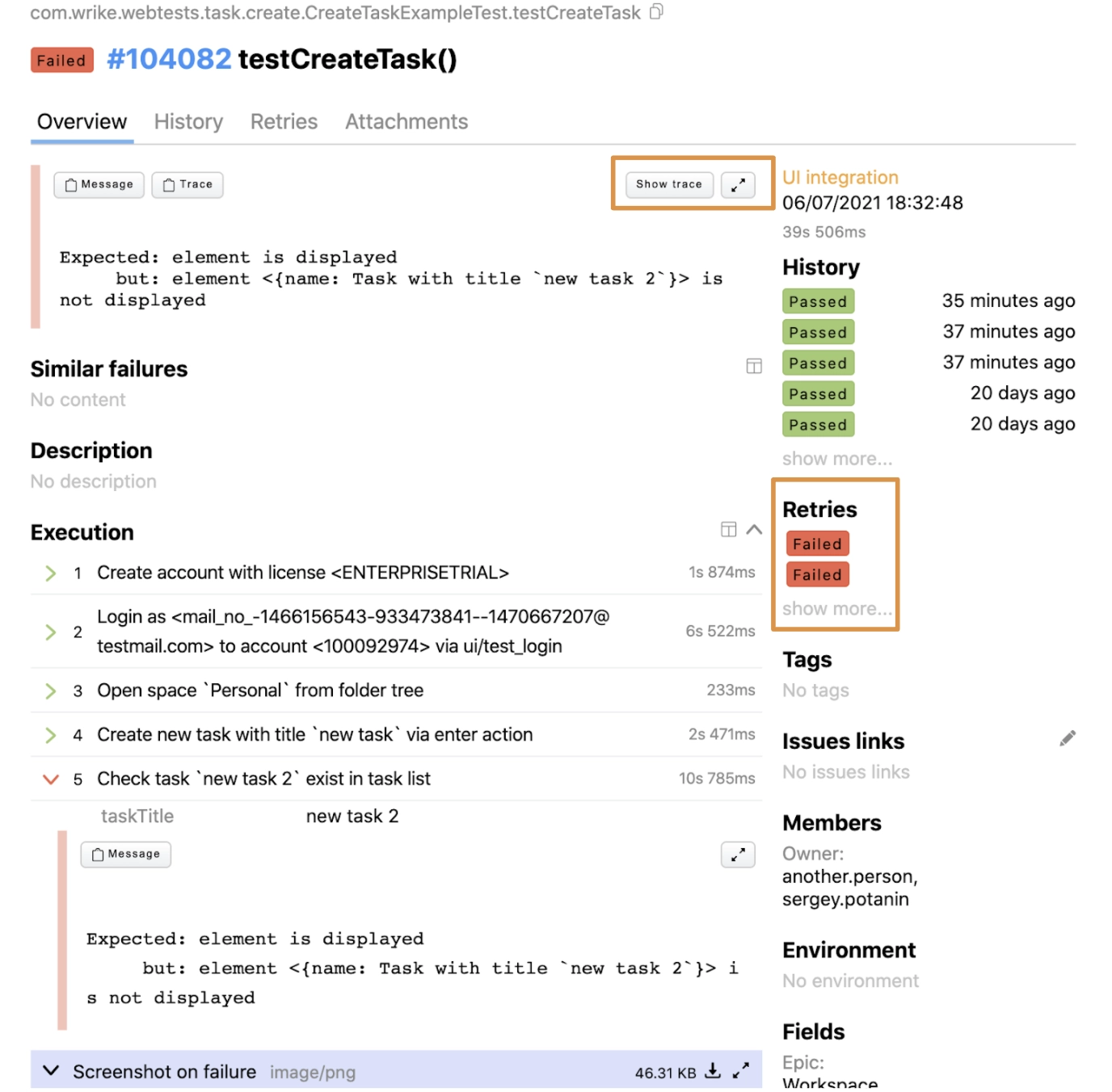 We can see the failed test’s stack trace and whether the test had retries and how many: