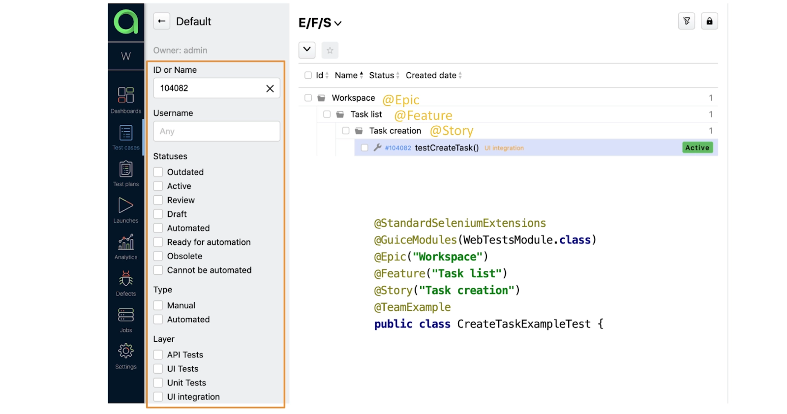 On the left panel, there are a lot of attributes to filter our tests. In this example, we found our test by its ID. On the right side is a search result that not only shows the test but also the nested structure, which represents Java annotations in the code.