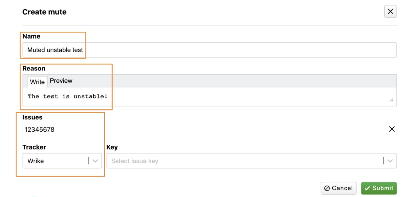 After muting you can set the name and the reason for the mute. Also, you can set the task tracker and link it to the actual task ID in this tracker. At Wrike we use Wrike as our tracker system and the issue ID would be the ID of a corresponding task in Wrike.