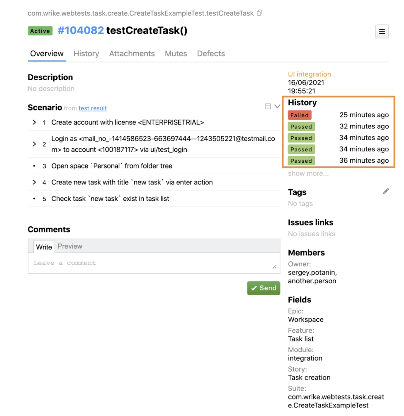 To find the test in Allure, we need to get its ID. At Wrike we use our custom annotation, @TestCaseId: