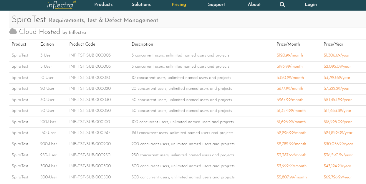 SpiraTest has different pricing plans depending on the number of users and whether it is cloud-based or on-premise. According to the search results, SpiraTest has 8 pricing editions ranging from $109.99 to $14,968.69.