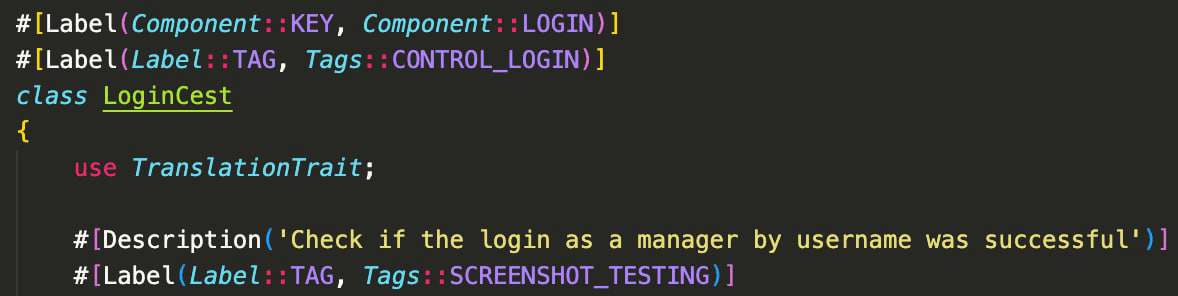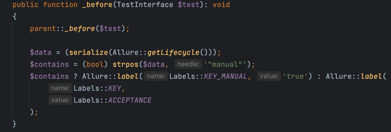 And for manual tests, we also use Inherited Methods, which are already implemented in Codeception, as well as the executeStep method from Allure.
