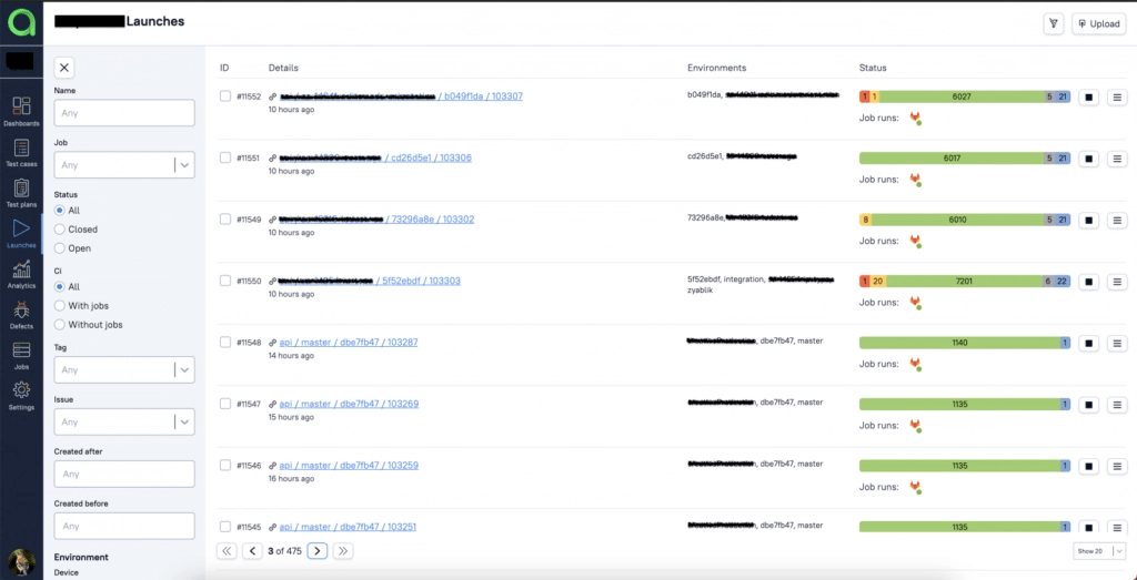 Several jobs have been configured to allow filtering by job, SHA-ref, or branch. Integration with JIRA has also been set up. After this, it is convenient to filter in Allure.